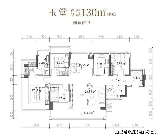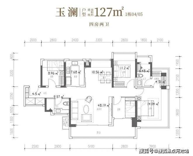 127-130㎡的4房2厅2卫,折后总价590-644万/套,单价4.56-5.06万。