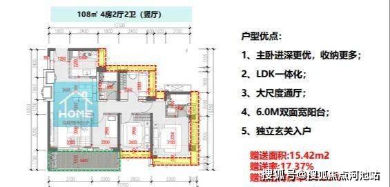 建筑面积约108㎡户型-4房2卫(竖厅)