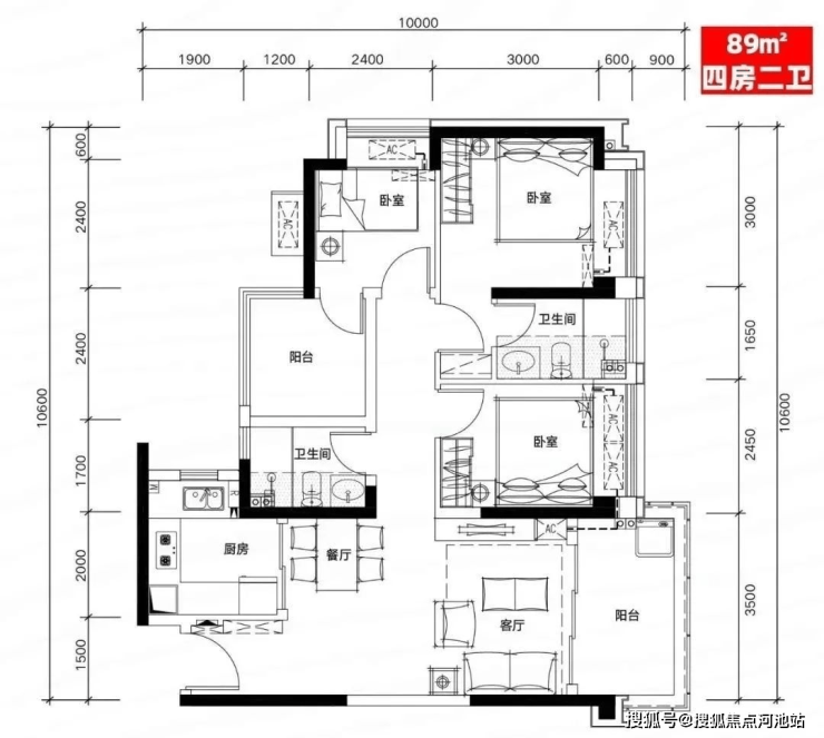 B02户型:89㎡四房二厅二卫