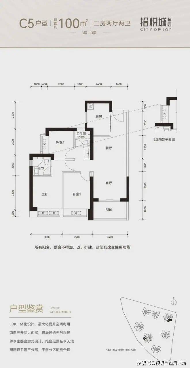 100平三房:设计的是竖厅格局,进门入户玄关,客厅3.4米开间,LDKB一体化设计,3个卧室分别做到了3米/2.9米/2.5米的宽度,U型厨房,公卫三段式分离,得房率:77.14%(不含赠送),阳台1.8米宽度,西南或东南朝向。