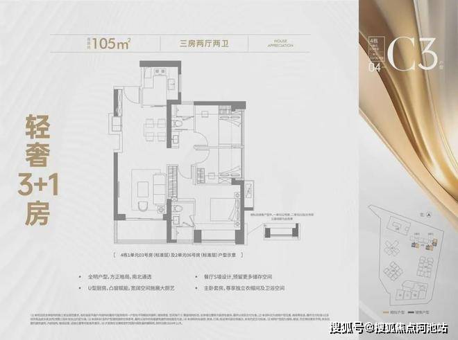 105平3房2厅2卫。