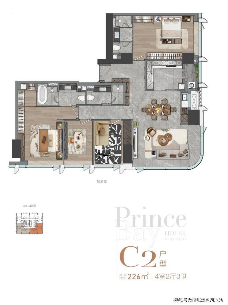 东南、西南向(39-50层)C2户型,226㎡ 4室2厅3卫,特点是主卧的卫生间比C1多了一个浴缸!