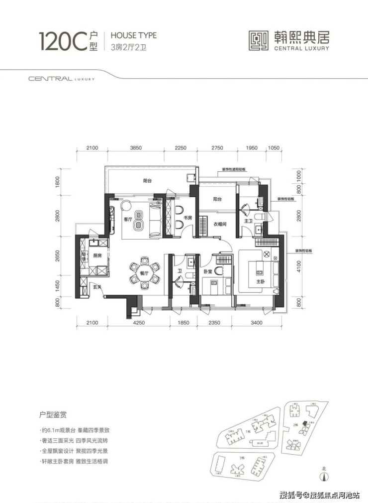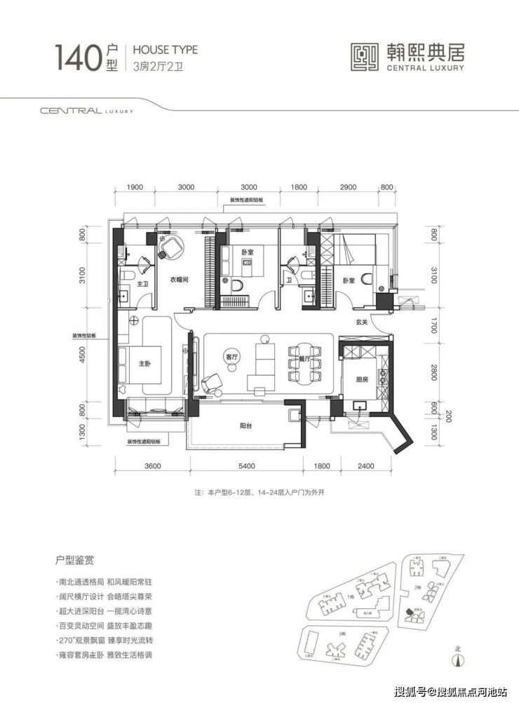 105㎡三房两卫,单朝向,厨卫及次卧需凹槽采光,无法实现大面积凸窗和主卫双面凸窗,面积较市场同功能三房大7-8㎡