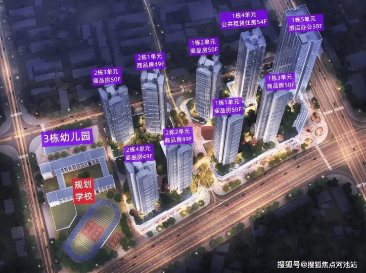 创城·云璞花园,项目分01,02地块开发,总占地面积约3.78万㎡,总建筑面积约38.8万㎡,其中计容建筑面积约31万㎡,容积率8.2,绿化率40%,共由9栋总高49-54层的超高层住宅组成,其中1栋1/2/3单元商品房50F,1栋4单元公共租赁住房54F,1栋5单元办公酒店38F,2栋1/2/4单元商品房49F,2栋3单元商品房50F,3栋是1所9班幼儿园。