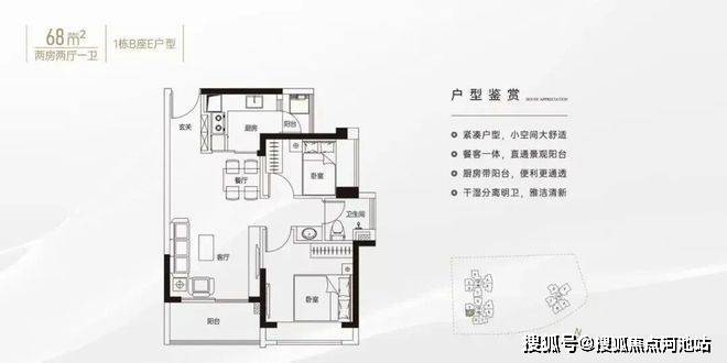 68㎡的2房2厅1卫,设计的是竖厅格局,客厅3.4米开间,LDKB一体化设计,动静分区,L型厨房带1个生活阳台,卫生间三段式干湿分离,得房率约79%(不含赠送),西南朝向。