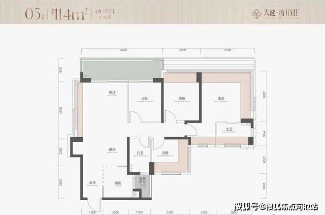 114㎡的4房2厅2卫,设计的是竖厅格局,客厅3.7米开间,LDKB一体化,客厅双面采光,凹墙设计预留冰箱卡槽位,动静分区,分别做到了主卧20.39㎡/次卧12㎡/次卧9.3㎡/次卧8.64㎡(包含墙体飘窗),L型厨房还带1个设备平台约2.86㎡,卫生间干湿分离,得房率约81%(不含赠送),客厅连接次卧出6.4米长的大阳台约11.52㎡,东北朝向。套内面积92.34㎡+飘窗17.25㎡+阳台5.76㎡+设备平台2.86㎡=实得面积118.21㎡,加上赠送后得房率约103.69%。