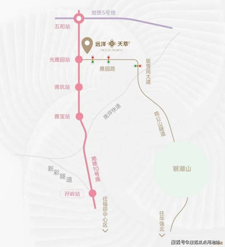 项目交通十分便利,楼下的光雅园站有地铁坂田线(10号线),南北走向通达福田至龙岗平湖,当中路过福田中心、华为一带产业聚拢区都是不少大厂人的通勤必经之路,还能直达福田口岸到香港。1站到五和枢纽站可换乘环中线(5号线)/ 深大城际,3站到贝尔路站可以转25号线,4站直达华为站。2站到坂田最大商业核心区星河World,3站到福田梅林,6站到福田岗厦北枢纽。