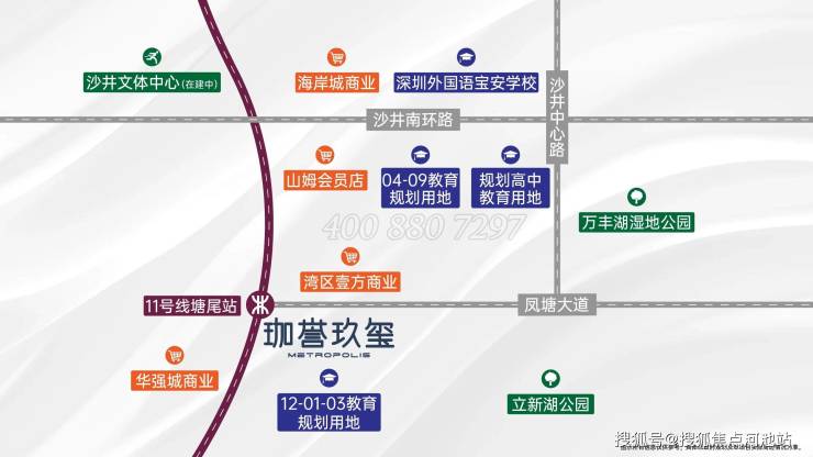 本项目位于深圳西部宝安沙井新桥,珈誉府本身是一个大型综合体,自身配套丰富,自带50万㎡大型商业;地铁11号线塘尾站挨着项目,深圳外国语宝安学校在项目南北两侧,且靠近万丰湖、立新湖,有生态资源。