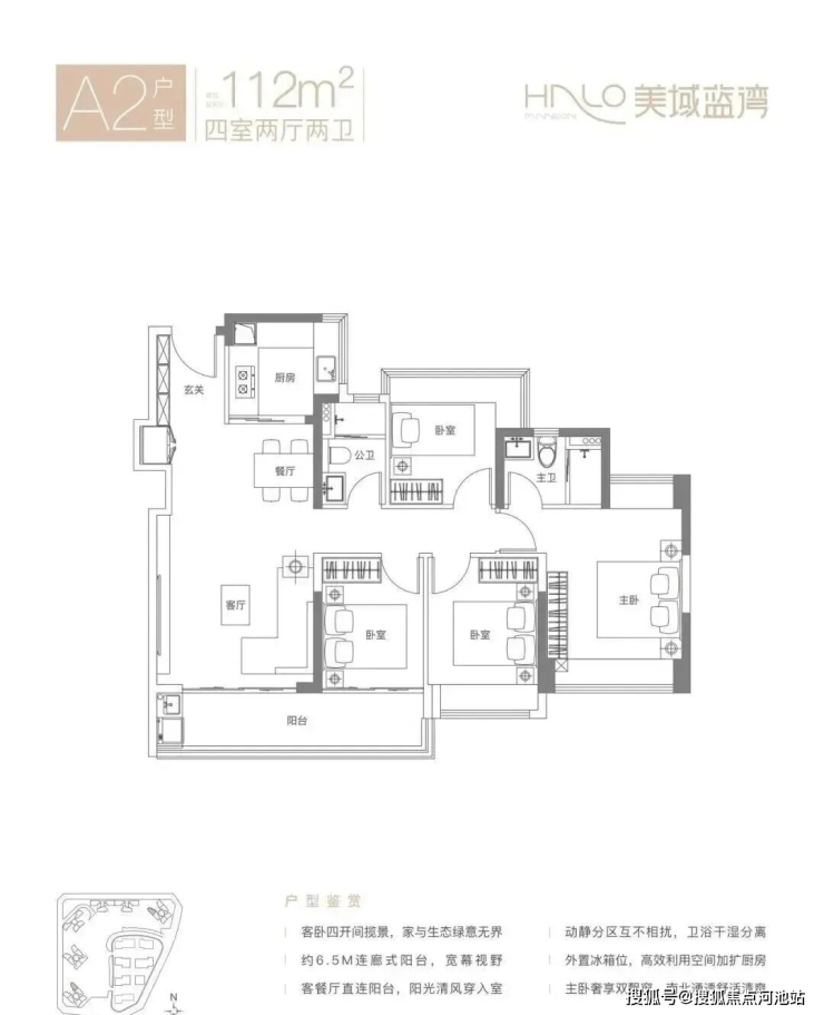 112㎡的4房2厅2卫,A2户型,竖厅南北通透格局,客厅3.9米开间,LDKB一体化设计,S墙设计预留冰箱卡槽位,动静分区,客厅连接次卧出6.5米长的大阳台,U型厨房,卫生间干湿分离,得房率约80.12%(不含赠送),西南或东北朝向。