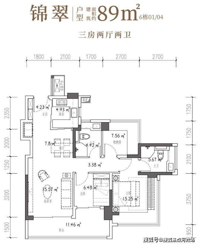 89㎡的3房2厅2卫,6栋02/03户型,设计的是经典竖厅格局,客厅3.5米开间,LDKB一体化,S墙设计预留冰箱卡槽位,三开间朝南,动静分区,主卧+次卧270°无柱转角飘窗,分别做到了主卧15.25㎡/次卧7.56㎡/次卧6.48㎡(包含墙体飘窗),U型厨房烟道外置,卫生间干湿分离,得房率约97.47%(包含赠送),客厅连接次卧出大阳台约11.46平,西南或东南朝向。主要区别在于次卧跟主卫空间。