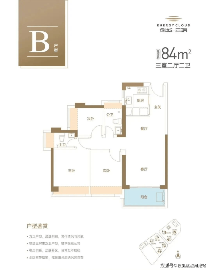 -84㎡3房2厅2卫:设计的是竖厅格局,LDKB一体化设计,客厅3.4米开间,U型厨房,卫生间干湿分离,阳台有正东、西北、东北、东南、西南朝向。