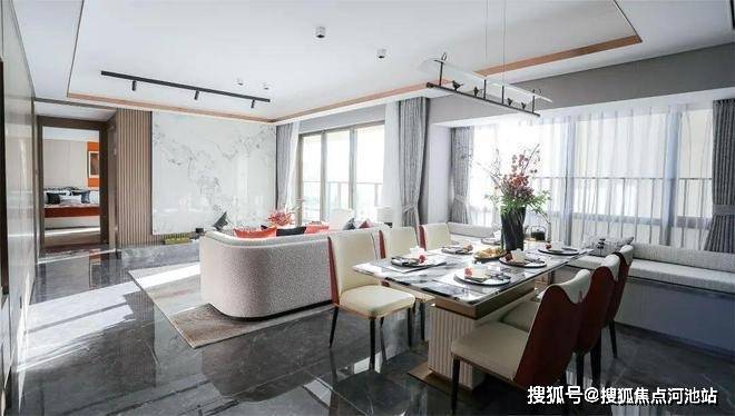 园林设计参考了国际先进的建筑设计理念,以“水岸之城”为主题,通过架空连廊天桥将项目园林与楼下的茅洲河衔接,形成了内外双园林的景观格局,兼得生活与自然的平衡之美。
