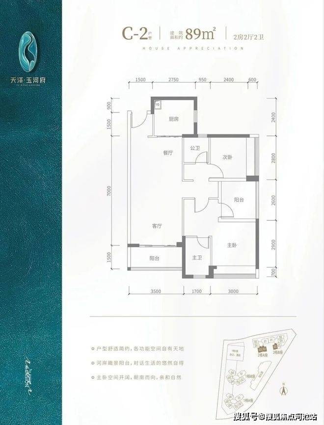 C2户型-89㎡-3房2厅2卫,2栋A座02/03,2栋B座02户型,设计的是竖厅格局,客厅3.5米开间,3个房间宽度分别为3/2.8/2.6米,公卫三段式分离,得房率:90.9%(包含赠送),阳台进深1.5米,东南朝向,看茅洲河景观。