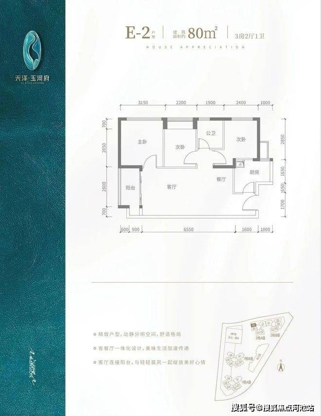 E2户型-80㎡-3房2厅1卫,2栋A座05户型,设计的是竖厅格局,客厅3.5米开间,餐客厅一体化,3个房间宽度分别为3.15/2.4/2.2米,L型厨房,得房率:83.7%(包含赠送),阳台进深1.5米,朝西南向。