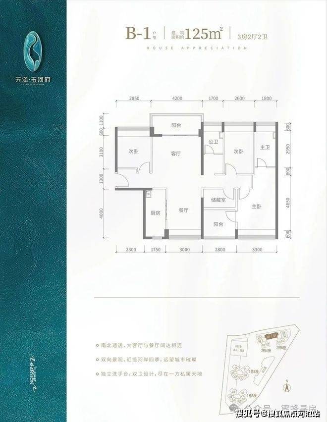 B1户型-125㎡-4房2厅2卫,设计的是竖厅南北通透格局,客厅4.2米开间,全屋飘窗设计,4个房间宽度分别为3.3/2.85/2.8/2.6米,L型厨房,得房率:91.1%(包含赠送),阳台进深1.7米,主朝西北朝向。