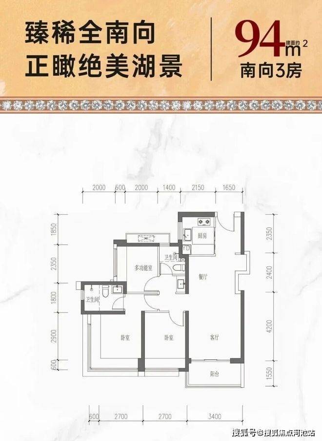 94㎡的3房2厅2卫,设计的是经典竖厅格局,客厅3.4米开间,LDKB一体化,S墙设计预留冰箱卡槽位,动静分区,三开间朝南,分别做到了主卧13.55㎡/次卧9.45㎡/次卧7.28㎡(包含墙体飘窗),U型厨房,公卫三段式干湿分离,得房率约74%(不含赠送),阳台东南朝向约5.27平。套内面积69.94㎡+赠送面积9.65㎡=实得面积79.59㎡,加上赠送后得房率约84.22%。
