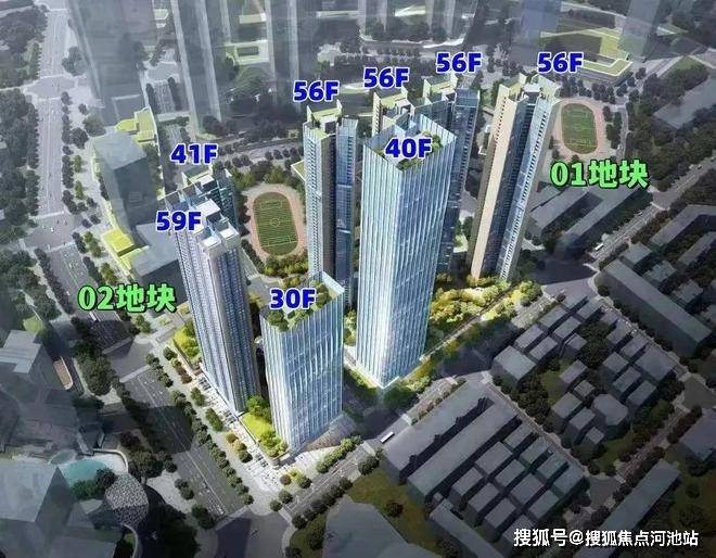 01-02地块,总占地面积约1.23万㎡,总建筑面积约15.08万㎡,计容建筑面积约10.85万㎡,容积率8.31,绿化率40.01%,共由2栋41-59F高的住宅组成,其中3栋住宅41F,4栋公共租赁住房59F,5栋办公楼30F,2栋是1所9班制幼儿园。