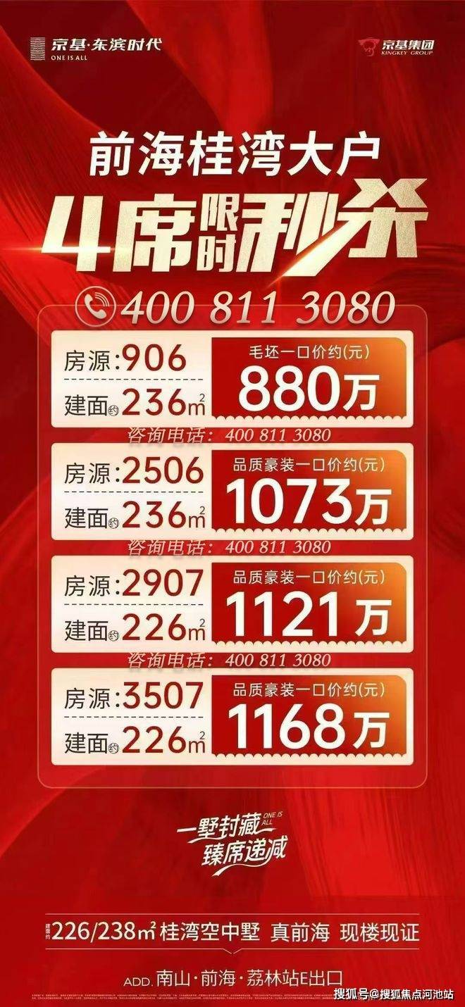 最新消息:【京基·东滨时代】位于深圳市南山前海路与东滨路交汇东北侧、距离地铁9号线荔林站200米;项目已经全面开盘,推出建面约93-236平米户型,目前清盘阶段、精装现楼!如需了解更多详情欢迎咨询东滨时代开发商全国免费400热线电话:400 811 3080(官方发布)中介请勿扰!