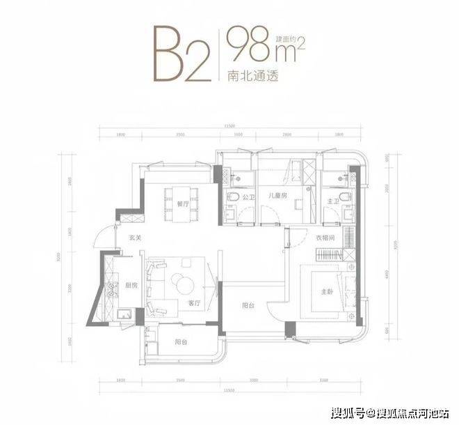 98㎡的3房2厅2卫,南北通透横厅,玄关入户。客厅3.28米宽,四室朝南,动静分区。主卧15.13m²/次卧10.85m²/次室8.25m²(含飘窗)。L型厨房,卫生间干湿分离。得房率75.91%(不含赠送),阳台5.6m²,西南或东南向。