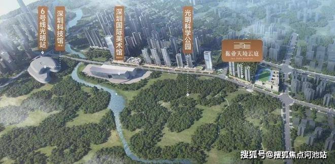 光明科学公园南侧光辉大道头排,仅规划2块纯居住用地,1块商住用地,其中地块A650-0385(R2纯居住用地)正是振业集团于2023年3月拍下的土地,罕有的一线景观资源地块,天赋卓越不可复制,未来难以再有。