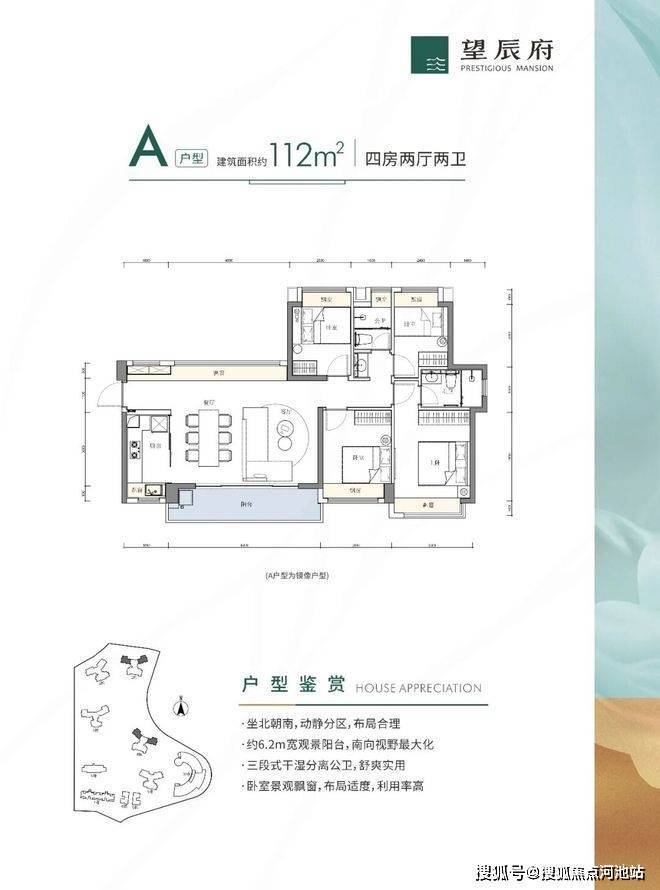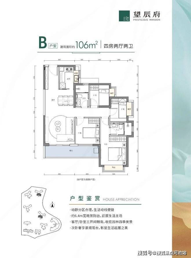 竖厅南北通透格局,客厅3.6米开间,四开间朝南,4个卧室分别是3.2米/2.9米/2.7/2.2米,全屋飘窗设计,U型厨房,得房率78.39%,6.3米长的超大阳台,主朝东南或西南向,看花园景观。折后347-360万