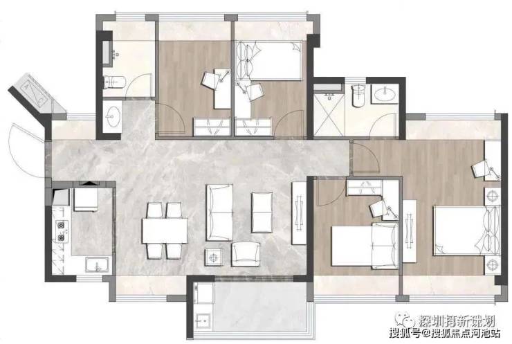 约89㎡竖厅三房两卫,这个户型跟79㎡的高度相似,除了主卧多了个私卫、其它各功能间有所放大外,其它区别不大。