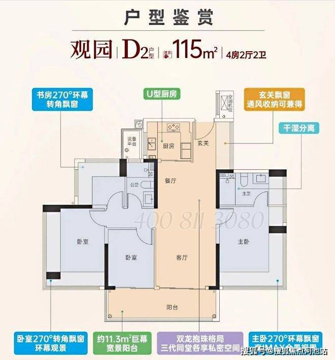 115㎡4房2卫户型:接近360°采光。双龙抱珠的格局下,两间卧室分置客厅两侧,使得三代同堂各享私密空间,不同家庭成员之间互不干扰、各自完整。