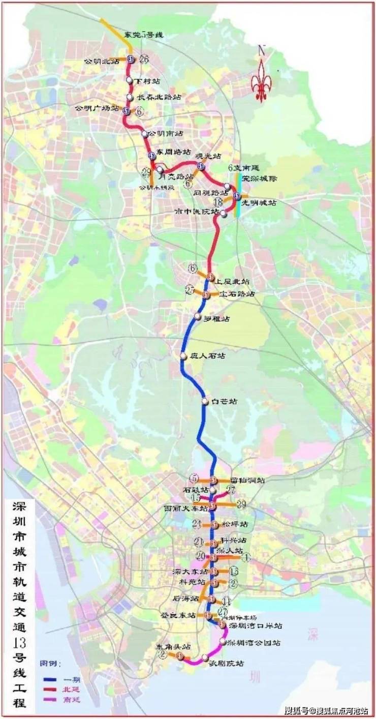此外,13号线二期(预计2025年开通),从上屋北向北延伸,直至光明的 公明北站与东莞轨道交通R5线换乘。
