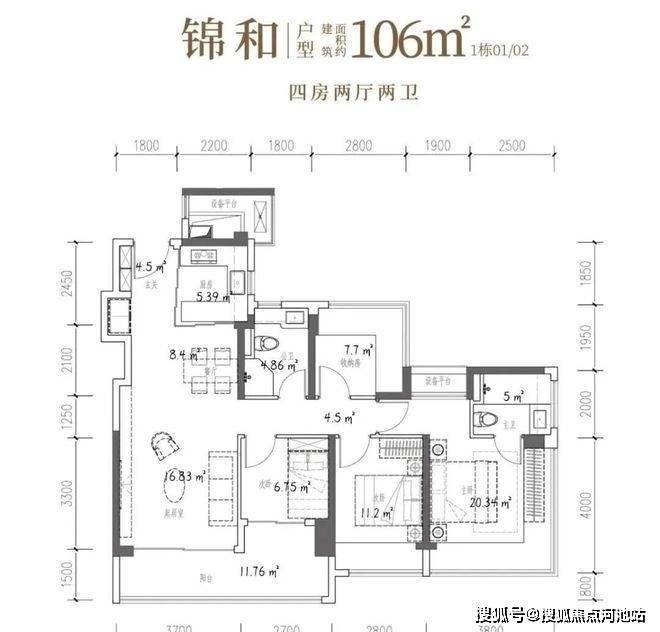 106㎡的4房2厅2卫,设计的是竖厅格局,客厅3.7米开间,LDKB一体化,S墙设计预留冰箱卡槽位,四开间朝南,动静分区,主卧270°无柱转角飘窗还带1个设备平台约1.52平,分别做到了主卧20.34㎡/次卧11.2㎡/次卧7.7㎡/次卧6.75㎡(包含墙体飘窗),U型厨房烟道外置,卫生间干湿分离,得房率约101.16%(包含赠送),客厅连接次卧出大阳台约11.76平,东南朝向。