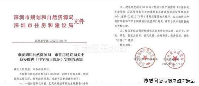 2025年10月9日,一份由深圳市规划和自然资源局、市住房和建设局联合发布关于稳妥推进《住宅项目规范》(GB55038-2025)实施的通知(以下简称《通知》),引发市场高度关注。《通知》明确,即日起报批建设的高度超80米住宅项目,应严格按照《住房和城乡建设部 应急管理部关于加强超高层建筑规划建设管理的通知》(建科〔2021〕76号)等规定履行相关程序,在土地供应和消防审查环节征求同级消防救援部门意见,确保与我市消防救援能力相匹配。