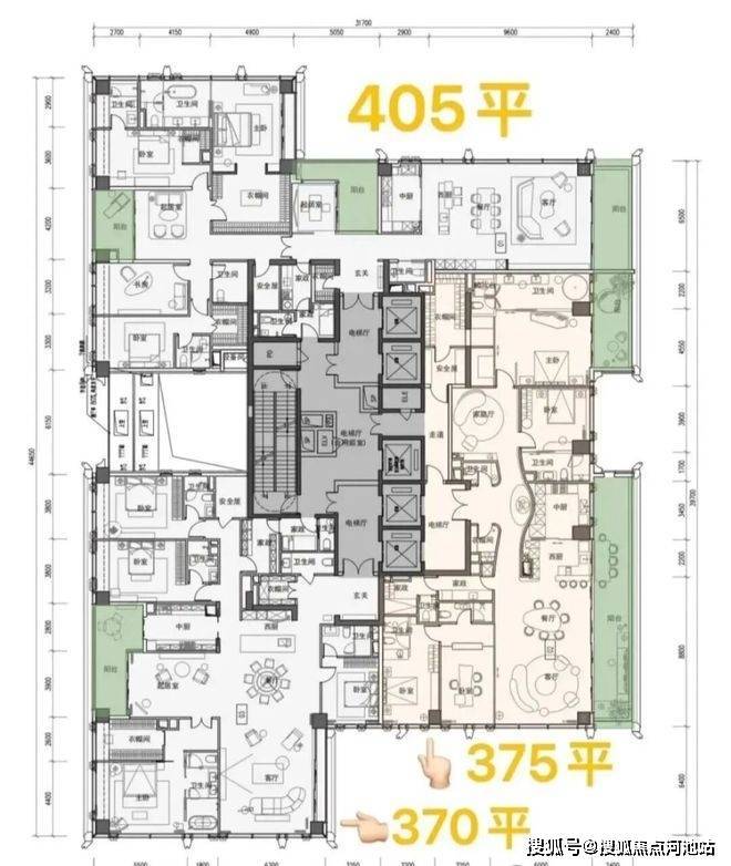 ·高区42F起(150-200米)是约370-375-403㎡4+1房五卫+家庭厅+家政套间;