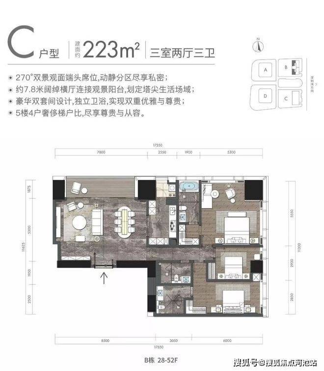 约223㎡3房2厅3卫(约7.8米阔绰横厅链接景观阳台)