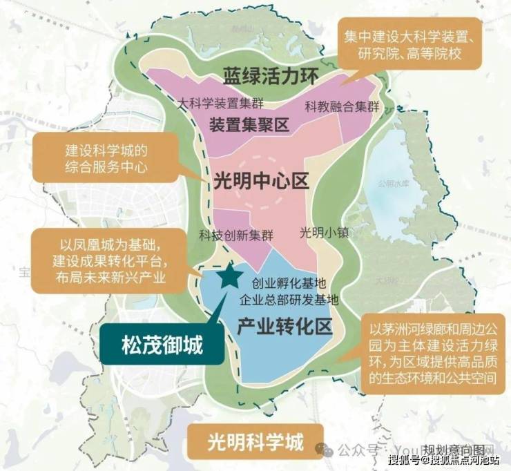 项目位于光明区,光明定位深圳新硅谷,以“一心两区、绿环萦绕”的空间格局,将打造为世界一流科学城。