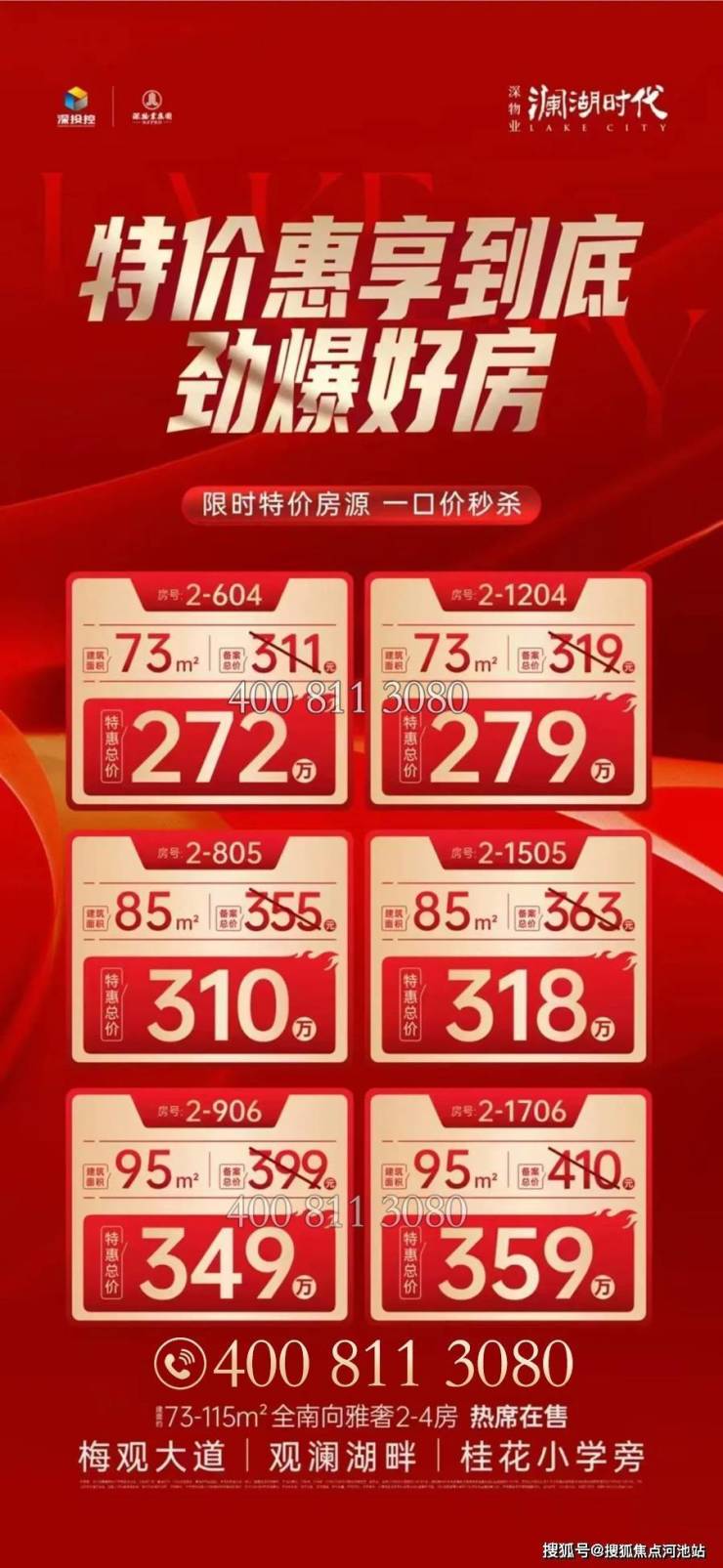 在售户型:73-85-95-115平2-4房,精装修,最低总价250万起!过来看房提前拨打深物业澜湖时代开发商售楼部电话:400-811-3080(已认证)来电预约的话,价格还可以更优惠!