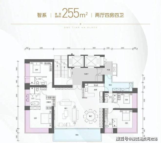255㎡的4房2厅4卫,1栋1单元01/02户型,设计的是竖厅双龙抱珠格局,专梯入户送超大私用入户空间,客厅9.7米开间,LDKB一体化设计,主卧带大衣帽间,三套房设计,分别做到了主卧34.02㎡/次卧24.18㎡/次卧18.3㎡/次卧15.16㎡(包含墙体飘窗),客厅连接餐厅出9.7米长的大阳台约22.31平,J型厨房带1个生活阳台约12.27平,卫生间干湿分离,得房率约96.7%(包含赠送,不含入户空间),西南或东北朝向。飘窗赠送面积24.8㎡+阳台赠送17.29㎡=实际赠送42.09㎡(不含电梯入户空间)。