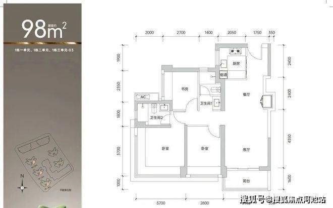建面约98㎡3房2卫,适合追求尺度的家庭。