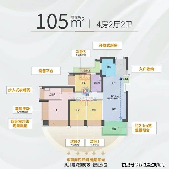 各户型多飘窗设计,空间利用灵动,功能全面,居住体验优。同时充分考虑了收纳空间的预留,S型墙体设计冰箱位,室内空间面整齐通透,细节处理到位。