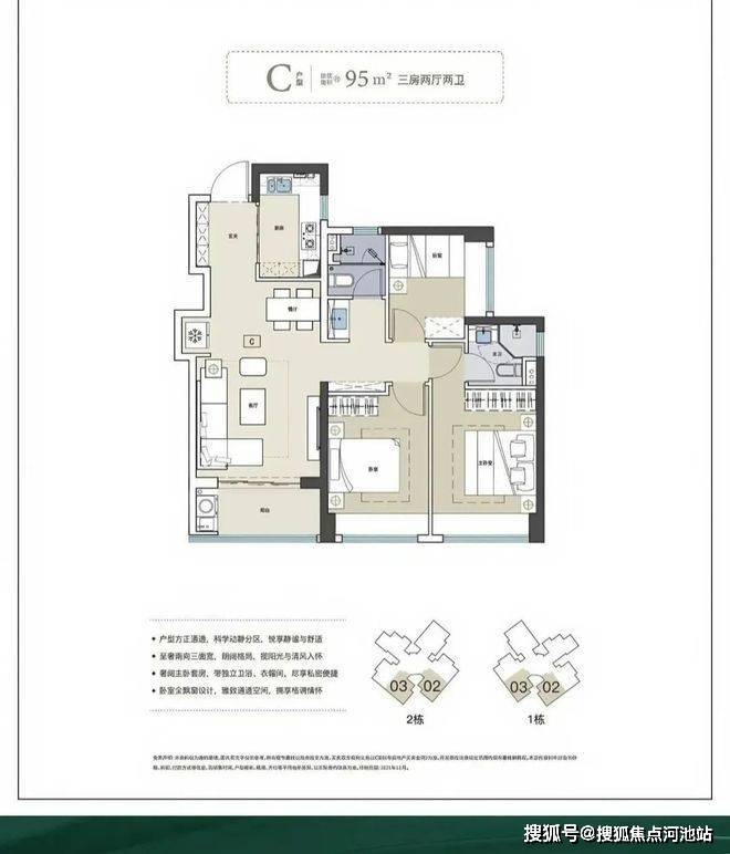 95㎡D户型三房,唯一真正意义上的通透户型,客餐厅纵向分布,动静分离、干湿分离、通风性佳,缺点是其阳台在北侧,日照相对不足。值得注意的是,户型中私密性最好的主卧,同样也实现了南北通透,纵向双面开窗,大尺度观景,清风与鲜氧自由穿梭,居住品质大幅拔高。