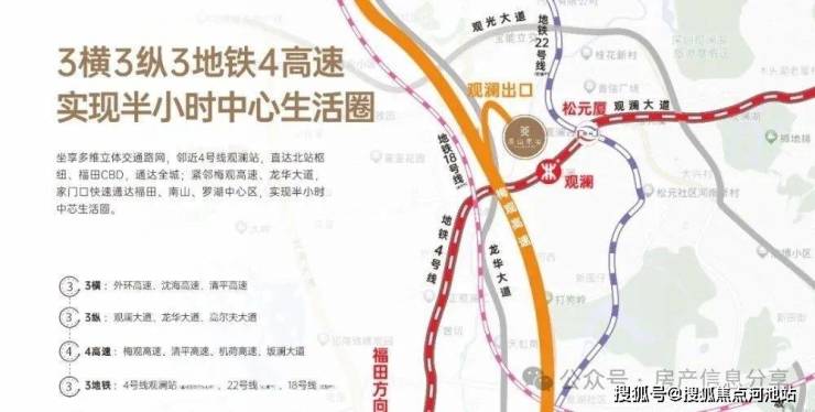 区域发展,离不开交通的建设。有3横3纵3地铁4高速的多维交通网,观澜片区可实现半小时中心生活区。