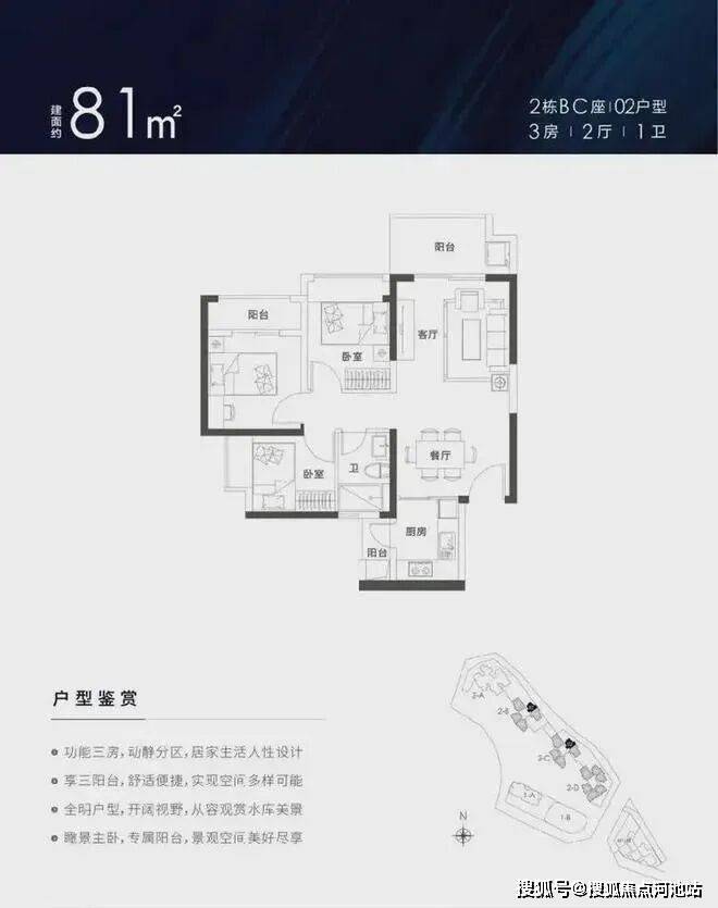 79-81㎡的3房2厅1卫,设计的竖厅格局,厨房带小阳台,客厅东北朝向,高层可看水库景观。
