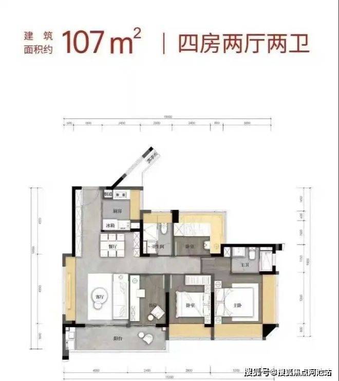 107m²的4房2厅2卫,折后总价429-465万/套,单价4.05-4.38万/m²。