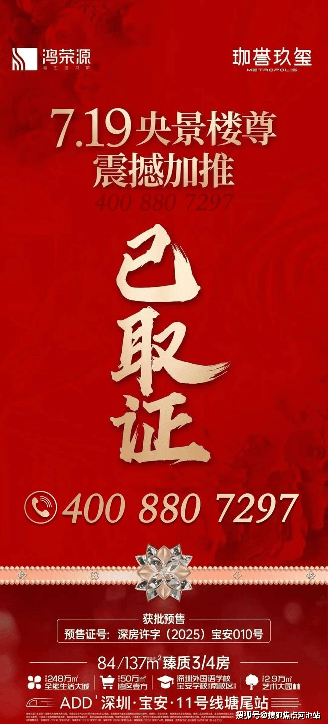 最新消息:深圳宝安沙井网红楼盘,【鸿荣源珈誉玖玺】已于2025年7月14日取证入市,计划7月19日开盘选房,本次新推10栋1单元,共262套房源,面积有84㎡的3房2卫,137㎡的4房2卫户型,备案均价5.26万/㎡,备案单价4.82-5.87万/㎡,总价405-802万/套,预约看房价格还可以更优惠,项目计划在2026年12月31日前带简装修交房,赠送全屋海尔中央空调。如需了解本楼盘更多详情,欢迎来电咨询鸿荣源珈誉玖玺开发商售楼处免费400咨询/预约电话:400-880-7297(已认证)中介请勿扰,因近期参观的人员太多,本项目营销中心暂不接受临时到访,为不耽误您的行程,过来楼盘现场参观样板房请务必记得提前来电预约,预约看房的话最终房价还能更加优惠,最终价格包您满意!