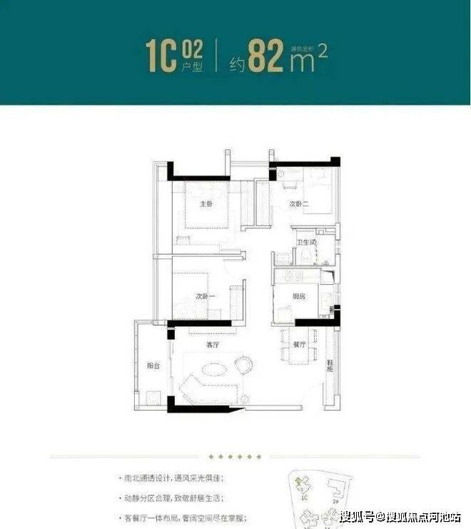 82㎡的3房2厅1卫(1栋C座01户型),设计的是竖厅南北通透格局,客厅3.6米开间,三开间朝南,动静分区,L型厨房,得房率:77.27%(不含赠送),阳台西南朝向。