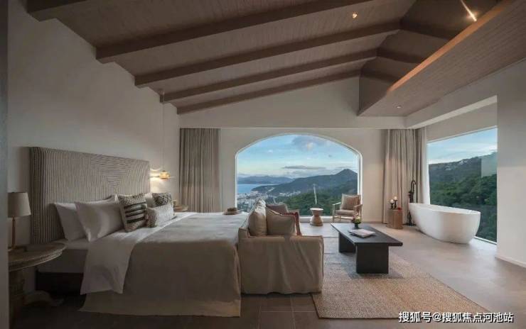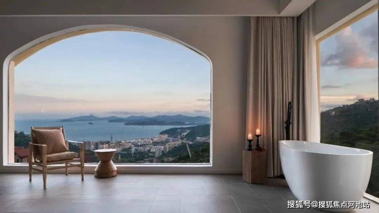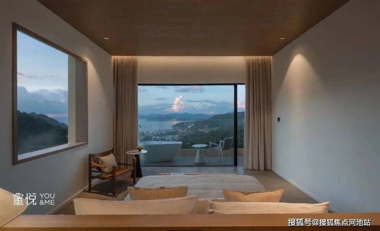 设计师巧妙地将山水画景引入室内,步入「衍然」房间,270°的全景落地窗,眼前的景象如一幅浓墨重彩的水墨画徐徐展开,令人为之心动。