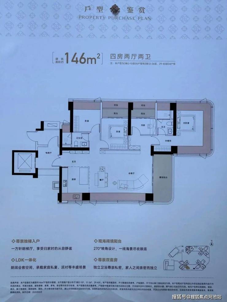将地标高度/创新设计/极致景观/自然融合四大要素集于一体,约150米地标建筑以45°错位转体设计,实现四户分踞四角的独立瞰景布局,每户均可享有极致山海景观。约55米超宽楼间距、0.6的黄金窗墙比远超常规住宅0.3-0.5的标准,呈现山景、海景、花园三重景观界面。