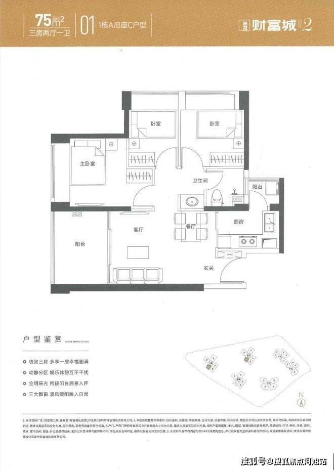 75㎡的3房2厅1卫,设计的是竖厅格局,客厅3.05米开间,3个卧室分别是3.1/2.85/2.25米的宽度,L型厨房,带1个小生活阳台,卫生间三段式分离设计,得房率约:76%(不含赠送),西南及西北朝向。