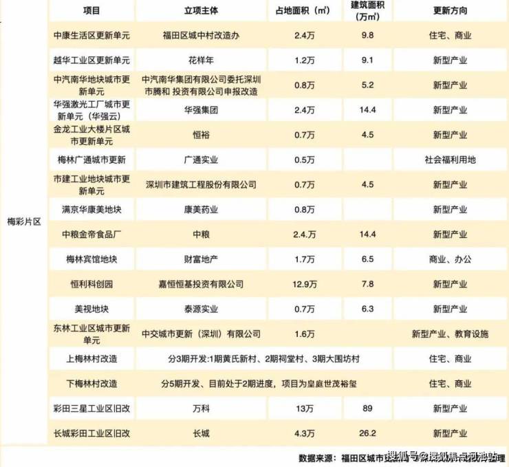 除了体量大之外,梅彩片区的旧改业态也很丰富。其中:居住类4个,新兴产业类有长城开发彩田工业园、华富街道三星工业区旧改等11个,以及新兴产业及配套类有2个。
