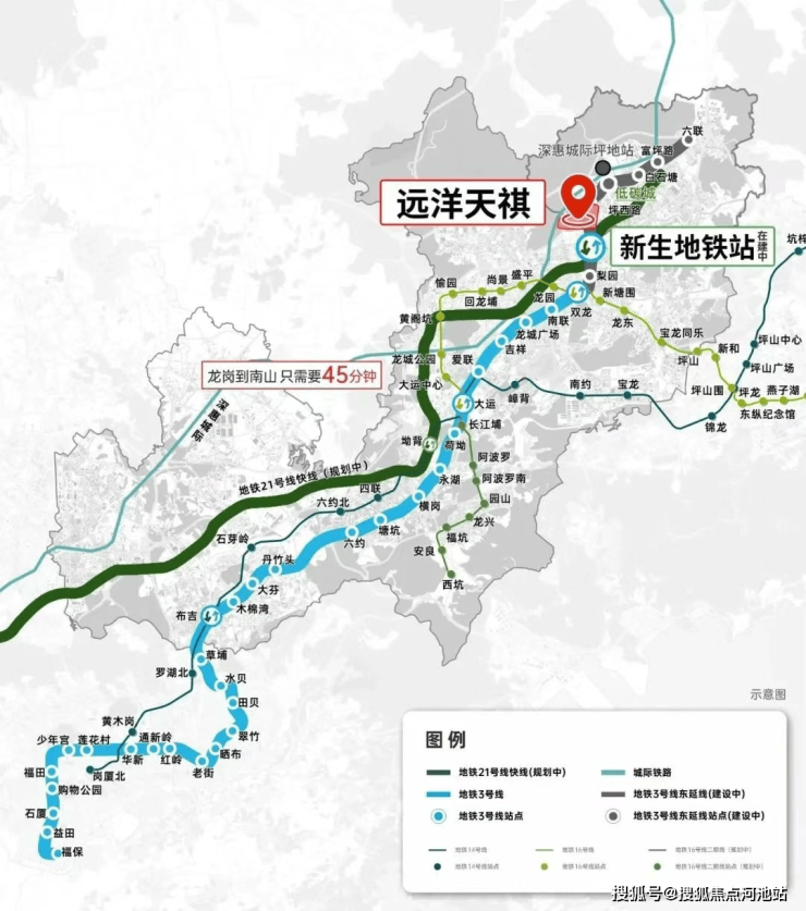 交通配套:远洋天祺紧邻地铁3号线东延线(已通车)和21号快线(规划中)双轨交汇的新生站,直线距离仅约500米,未来还将近邻深惠城际(建设中)坪地站,形成轨道交通网络。3号线东延线全长约58.9公里,设11座客运站,设计速度160公里/小时,通车后将实现前海蛇口自贸片区至龙岗、惠州等地区的"1小时交通圈"。