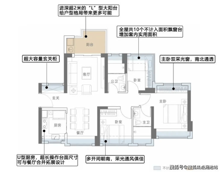 79㎡的3房2厅1卫,设计的是经典竖厅格局,进门入户玄关,客厅3.3米开间,LDKB一体化,10米进深,S墙设计预留冰箱卡槽位,动静分区,三开间朝南,分别做到了主卧11.2㎡/次卧9㎡/次卧7.28㎡(包含墙体飘窗),U型厨房,卫生间三段式分离,得房率73.42%(不含赠送),套内面积57.76㎡,西南或东南朝向。