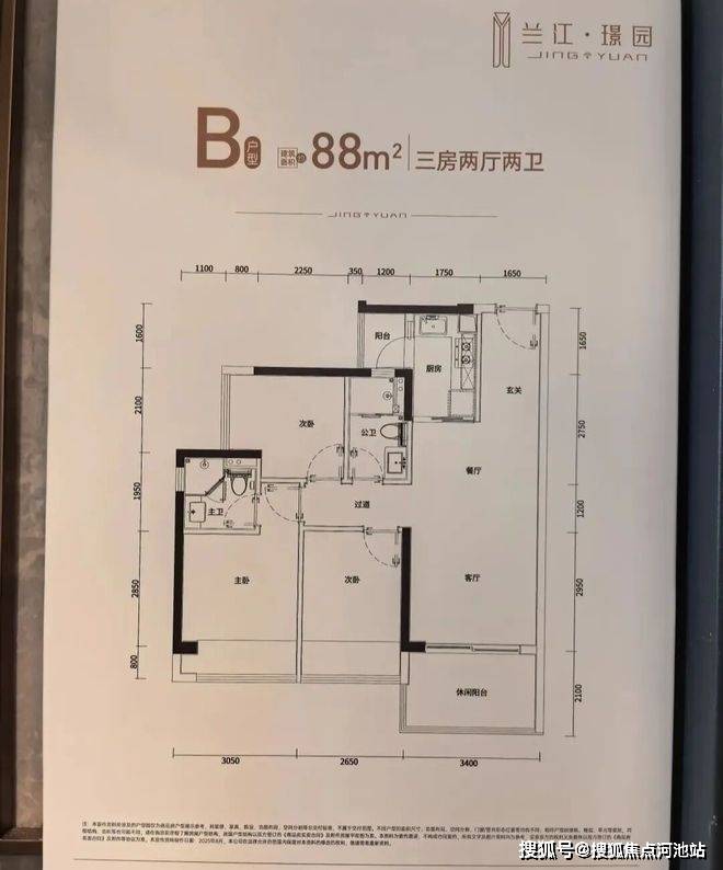 88m²的3房2厅2卫,设计的经典竖厅格局,进门入户玄关,客厅3.4米开间,LDKB一体化设计,三开间朝南,动静分区,分别做到了主卧10.98m²/次卧9.3m²/次卧6.49m²(实测面积,去掉墙体),L型厨房带1个小生活阳台1.92m²,卫生间干湿分离,得房率78.8%(不含赠送),客厅阳台7.14平东南朝向,看小区园林或比亚迪+山景。套内面积68.73m²+飘窗6.24m²+阳台4.53m²=实际套内79.5m²,加上赠送面积后得房率约90.62%。
